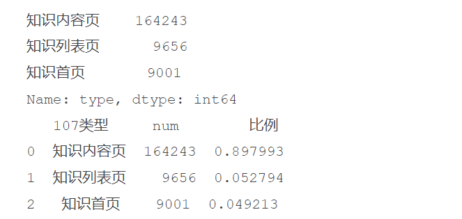 # 代码11-3 import pandas as pd # 因为只有107001一类,但是可以继续细分成三类:知识内容页、知识列表页、知识首页 def count107(i): #自定义统计函数 j = i[['fullURL']][i['fullURLId'].str.contains('107')].copy() # 找出类别包含107的网址 j['type'] = None # 添加空列 j['type'][j['fullURL'].str.contains('info/.+?/')]= '知识首页' j['type'][j['fullURL'].str.contains('info/.+?/.+?')]= '知识列表页' j['type'][j['fullURL'].str.contains('/\d+?_*\d+?\.html')]= '知识内容页' return j['type'].value_counts() # 注意:获取一次sql对象就需要重新访问一下数据库(!!!) #engine = create_engine('mysql+pymysql://root:123456@127.0.0.1:3306/test?charset=utf8') sql = pd.read_sql('all_gzdata', engine, chunksize = 10000) counts2 = [count107(i) for i in sql] # 逐块统计 counts2 = pd.concat(counts2).groupby(level=0).sum() # 合并统计结果 print(counts2) #计算各个部分的占比 res107 = pd.DataFrame(counts2) # res107.reset_index(inplace=True) res107.index.name= '107类型' res107.rename(columns={'type':'num'}, inplace=True) res107['比例'] = res107['num'] / res107['num'].sum() res107.reset_index(inplace = True) print(res107)