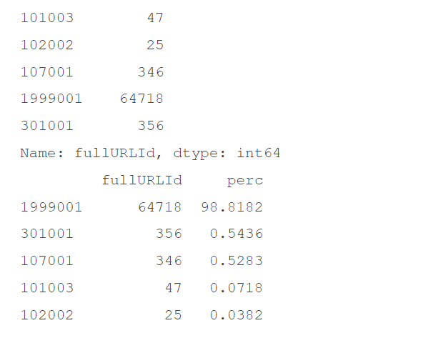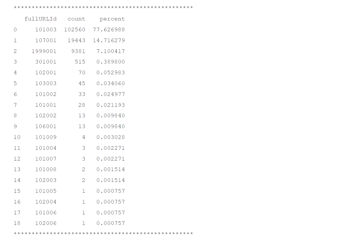 # 代码11-4 def countquestion(i): # 自定义统计函数 j = i[['fullURLId']][i['fullURL'].str.contains('\?')].copy() # 找出类别包含107的网址 return j #engine = create_engine('mysql+pymysql://root:123456@127.0.0.1:3306/test?charset=utf8') sql = pd.read_sql('all_gzdata', engine, chunksize = 10000) counts3 = [countquestion(i)['fullURLId'].value_counts() for i in sql] counts3 = pd.concat(counts3).groupby(level=0).sum() print(counts3) # 求各个类型的占比并保存数据 df1 = pd.DataFrame(counts3) df1['perc'] = df1['fullURLId']/df1['fullURLId'].sum()*100 df1.sort_values(by='fullURLId',ascending=False,inplace=True) print(df1.round(4))