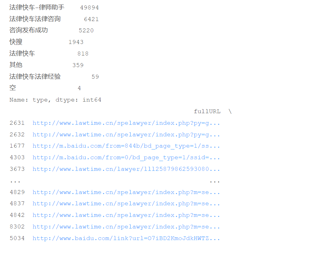 # 代码11-5 def page199(i): #自定义统计函数 j = i[['fullURL','pageTitle']][(i['fullURLId'].str.contains('199')) & (i['fullURL'].str.contains('\?'))] j['pageTitle'].fillna('空',inplace=True) j['type'] = '其他' # 添加空列 j['type'][j['pageTitle'].str.contains('法律快车-律师助手')]= '法律快车-律师助手' j['type'][j['pageTitle'].str.contains('咨询发布成功')]= '咨询发布成功' j['type'][j['pageTitle'].str.contains('免费发布法律咨询' )] = '免费发布法律咨询' j['type'][j['pageTitle'].str.contains('法律快搜')] = '快搜' j['type'][j['pageTitle'].str.contains('法律快车法律经验')] = '法律快车法律经验' j['type'][j['pageTitle'].str.contains('法律快车法律咨询')] = '法律快车法律咨询' j['type'][(j['pageTitle'].str.contains('_法律快车')) | (j['pageTitle'].str.contains('-法律快车'))] = '法律快车' j['type'][j['pageTitle'].str.contains('空')] = '空' return j # 注意:获取一次sql对象就需要重新访问一下数据库 #engine = create_engine('mysql+pymysql://root:123456@127.0.0.1:3306/test?charset=utf8') sql = pd.read_sql('all_gzdata', engine, chunksize = 10000)# 分块读取数据库信息 #sql = pd.read_sql_query('select * from all_gzdata limit 10000', con=engine) counts4 = [page199(i) for i in sql] # 逐块统计 counts4 = pd.concat(counts4) d1 = counts4['type'].value_counts() print(d1) d2 = counts4[counts4['type']=='其他'] print(d2) # 求各个部分的占比并保存数据 df1_ = pd.DataFrame(d1) df1_['perc'] = df1_['type']/df1_['type'].sum()*100 df1_.sort_values(by='type',ascending=False,inplace=True) print(df1_)