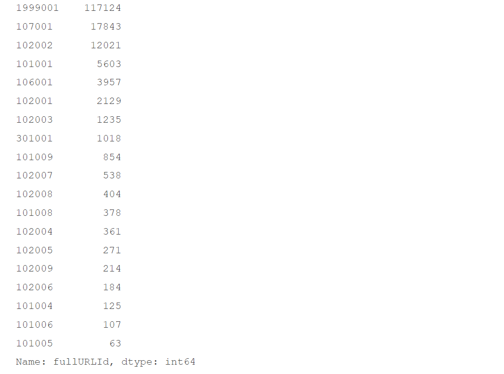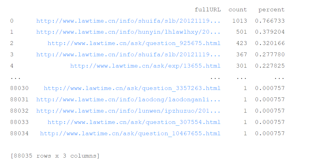 # 代码11-9 # 在浏览1次的前提下, 得到的网页被浏览的总次数 fullURL_count = pd.DataFrame(real_one.groupby("fullURL")["fullURL"].count()) fullURL_count.columns = ["count"] fullURL_count["fullURL"] = fullURL_count.index.tolist() fullURL_count.sort_values(by='count', ascending=False, inplace=True) # 降序排列