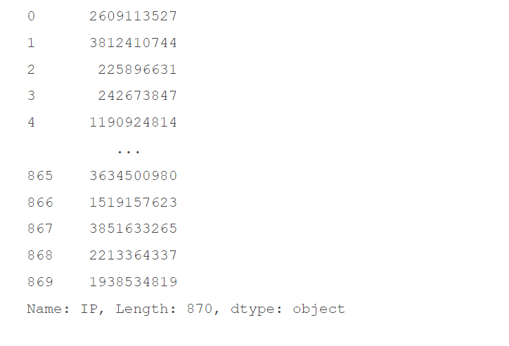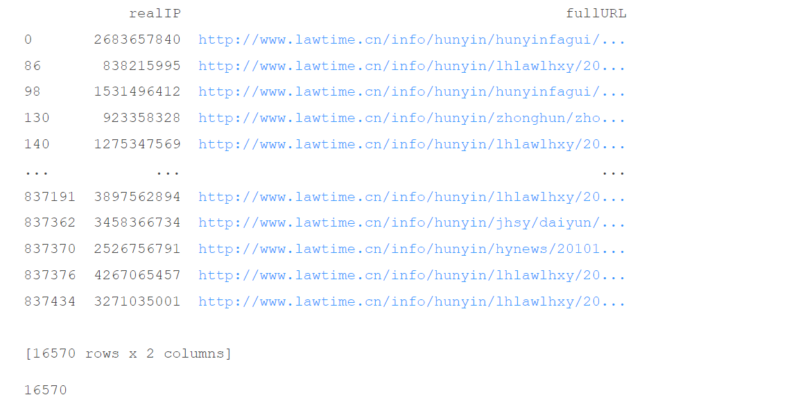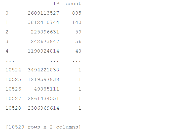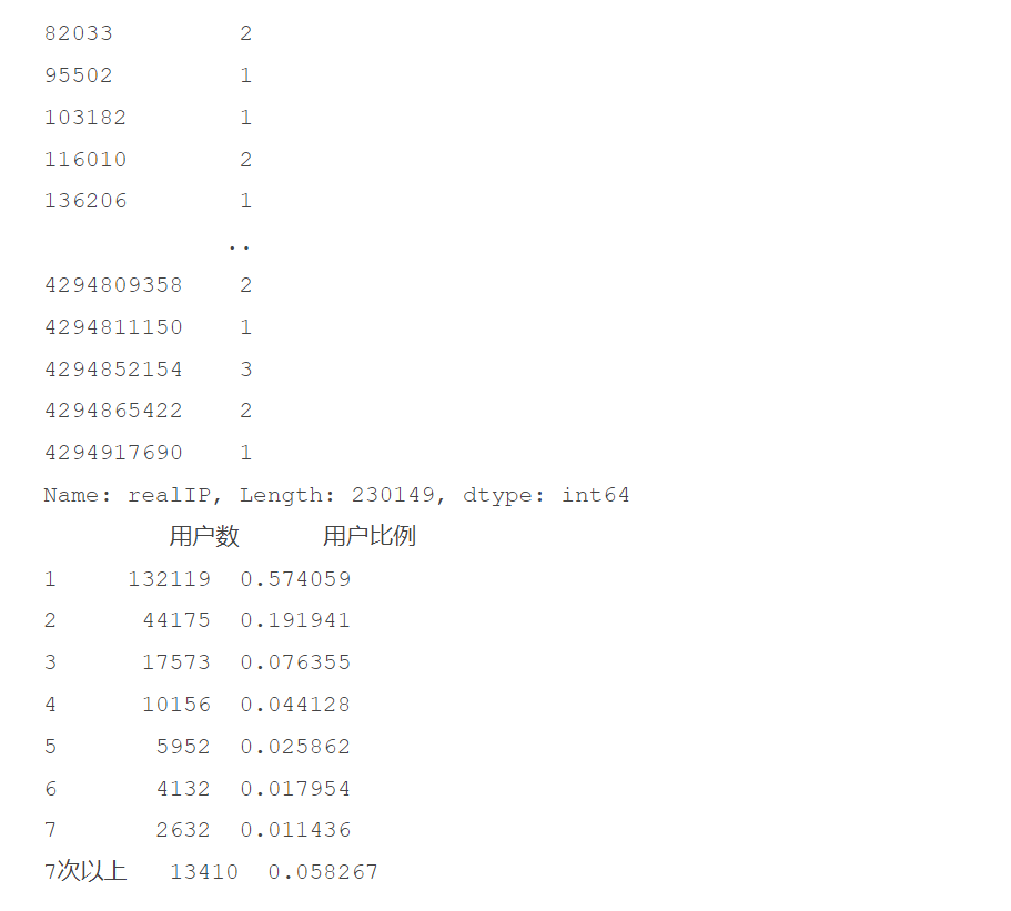 # 代码11-12 # 筛选满足一定浏览次数的IP IP_count = info3['realIP'].value_counts() # 找出IP集合 IP = list(IP_count.index) count = list(IP_count.values) # 统计每个IP的浏览次数,并存放进IP_count数据框中,第一列为IP,第二列为浏览次数 IP_count = pd.DataFrame({'IP':IP,'count':count}) # 3.3筛选出浏览网址在n次以上的IP集合 n = 2 index = IP_count.loc[:,'count']>n IP_index = IP_count.loc[index,'IP']