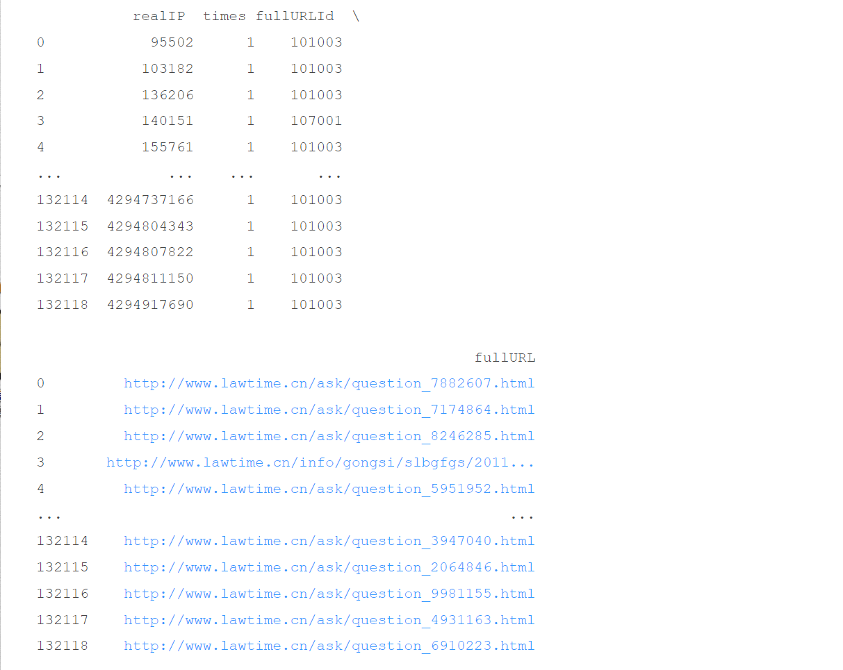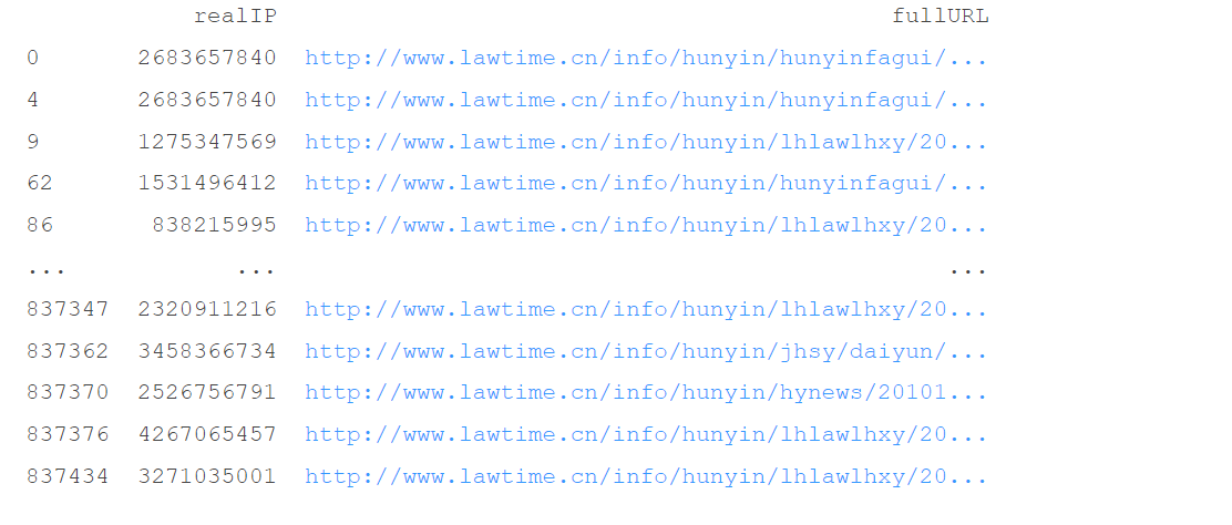 # 代码11-11 # 找出翻页和非翻页网址 index = [re.search('/\d+_\d+\.html',i)!=None for i in info1.loc[:,'fullURL']] index1 = [i==False for i in index] info1_1 = info1.loc[index,:] # 带翻页网址 info1_2 = info1.loc[index1,:] # 无翻页网址 # 将翻页网址还原 da = [re.sub('_\d+\.html','.html',str(i)) for i in info1_1.loc[:,'fullURL']] info1_1.loc[:,'fullURL'] = da # 翻页与非翻页网址合并 frames = [info1_1,info1_2] info2 = pd.concat(frames) # 或者 info2 = pd.concat([info1_1,info1_2],axis = 0) # 默认为0,即行合并 # 去重(realIP和fullURL两列相同) info3 = info2.drop_duplicates() # 将IP转换成字符型数据 info3.iloc[:,0] = [str(index) for index in info3.iloc[:,0]] info3.iloc[:,1] = [str(index) for index in info3.iloc[:,1]] len(info3)