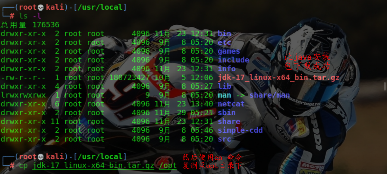 输入命令:cp jdk-17.0.1_linux-x64_bin.tar.gz /opt将压缩包移动至/opt文件夹