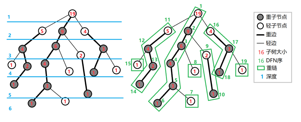 向下经过一条轻边时,所在子树的大小至少会除以二。那么有:对于树上任意一条路径,把它拆分成从\(lca\)往下走,分别最多走\(O(logn)\)次。树上的每条路径都可以被拆分成不超过\(O(logn)\)条重链。