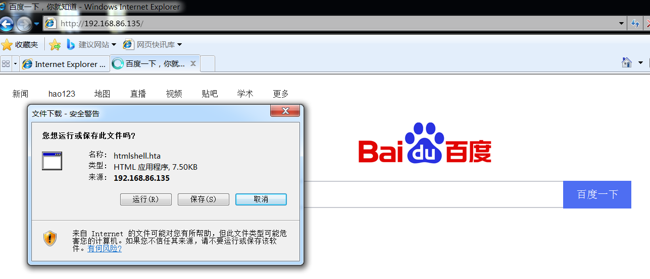 目标访问连接后就会弹到百度的网站,并且提示受害者是否下载木马,目标下载运行木马后,就会上线cs