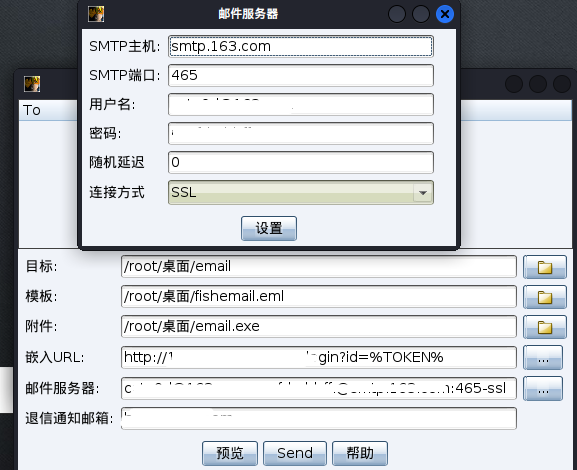 在CS中进行配置,配置Mail Server模块,用于批量发送钓鱼邮件,点击Attack->spare phish配置钓鱼模块:Targets: 选择刚刚设置好的目标邮件的txt文件(邮箱+姓名);Template:选择刚刚生成的邮件模板;Attachment:选择生成的附件Beacon 可执行文件;Embed URL:钓鱼邮件的网址;Mail Server设置如下(需要登陆到邮件系统开启POP3/SMTP服务)并生成授权码;SMTP Host: 配置邮件服务器一般都可以在邮件系统中查看;SMTP Port: 设置邮件服务器的端口;username: 邮箱号;Password: 授权码;点击set后,点击send会向目标用户批量发送钓鱼邮件。