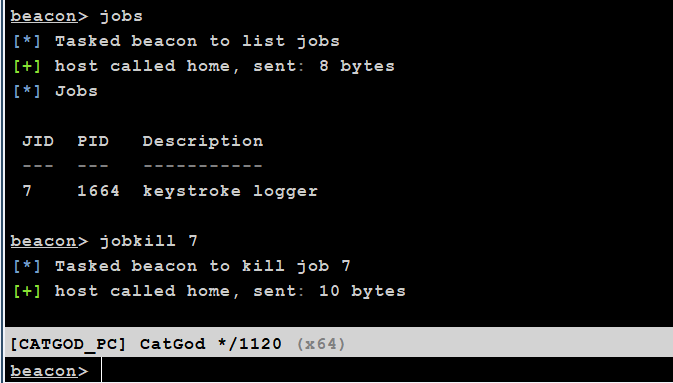 如果想停止键盘记录进程的话,使用进程处理,jobs查看任务进程,jobkill <id>终止进程