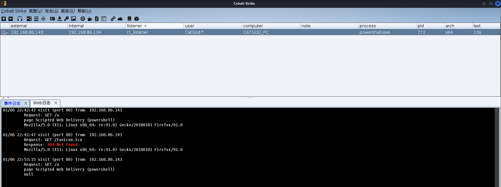 8、在靶机中的powershell运行payload,然后在Cobalt Strike中可对其进行其他操作