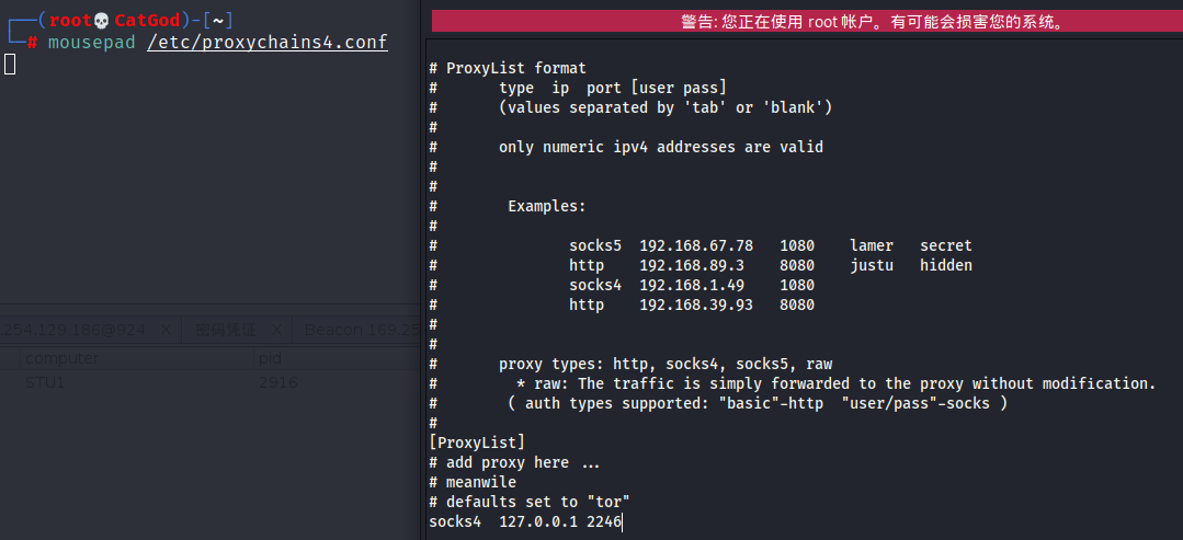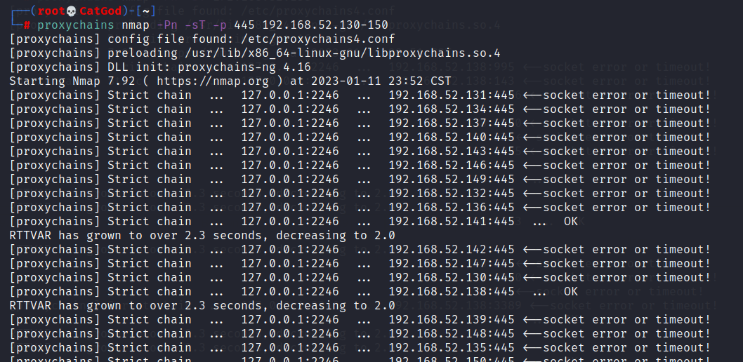 2、在kali终端更改配置,开启proxychains工具,扫描域内主机ip的445端口,同时可以使用tcp扫描开放的端口