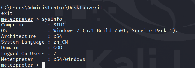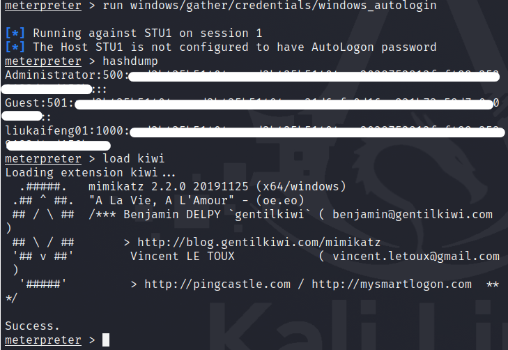 # 使用kiwi模块需要拥有system权限,可以使用前面的getsystem或者在shell中使用其他手段进行提权