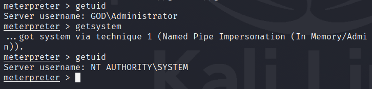 getsystem # 自动提权为系统权限(可能会失败,也有可能为假权限)
