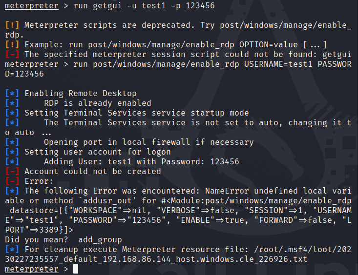 run post/windows/manage/enable_rdp USERNAME=test2 PASSWORD=Abc123456 # 添加用户