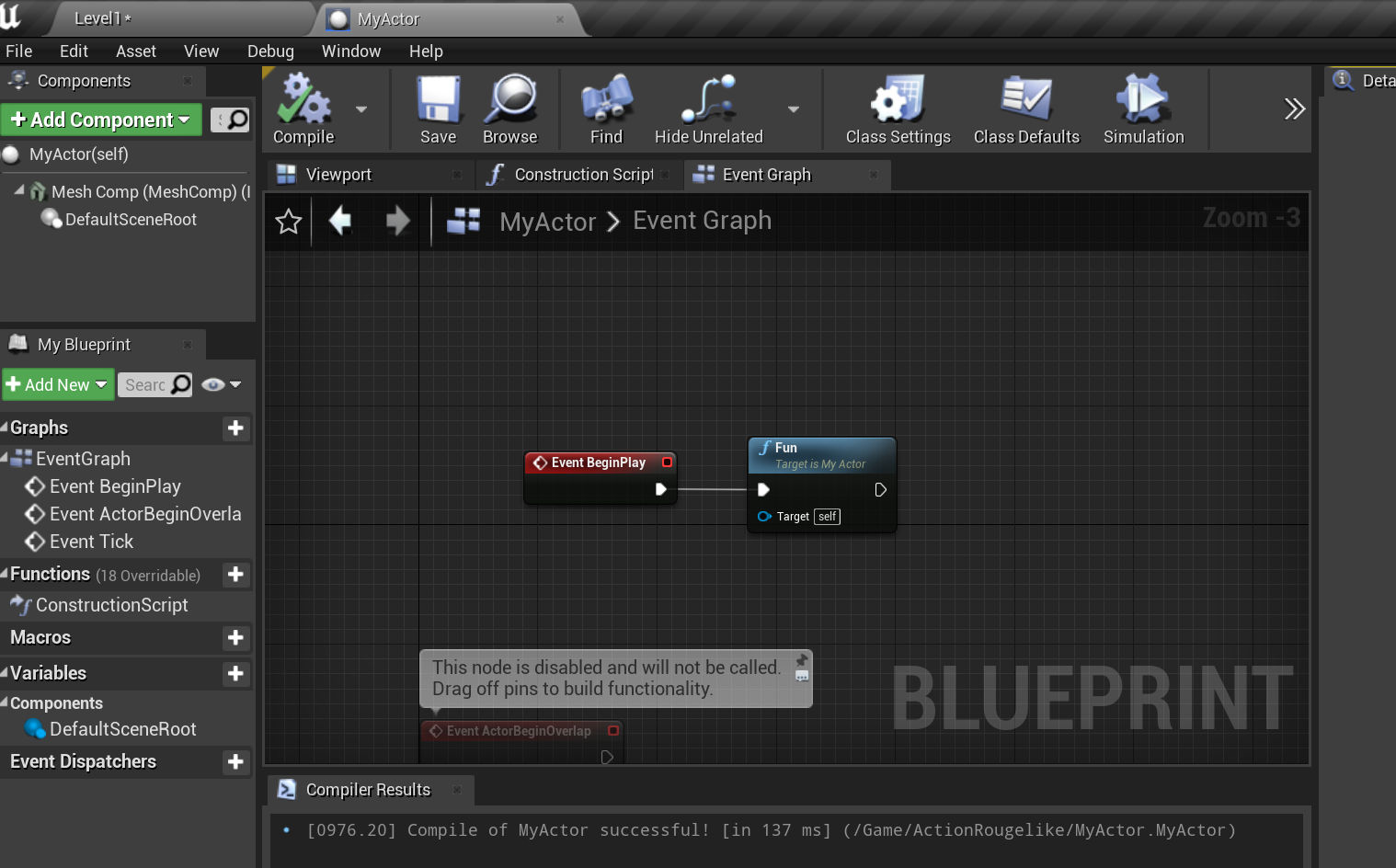 重申一下,它只适用于没有参数的函数,并返回void。且BlueprintCallable不是必需的。仅适用于类的实例,所以Actor被放在一个关卡里,而不是放在蓝图类里。