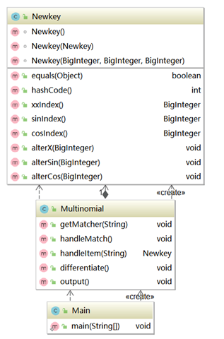 第二次作业相较于第一次作业并没有发生质的变化。由于加入了sin(x)和cos(x),每一项的特征变为了:系数、x的指数、sin(x)的指数、cos(x)的指数,所以我改用hashmap存储项,并新建一个类作为hashmap的key保存了三个指数。同样用正则表达式把表达式分割成项,然后计算项的系数和各个指数,再进行合并。