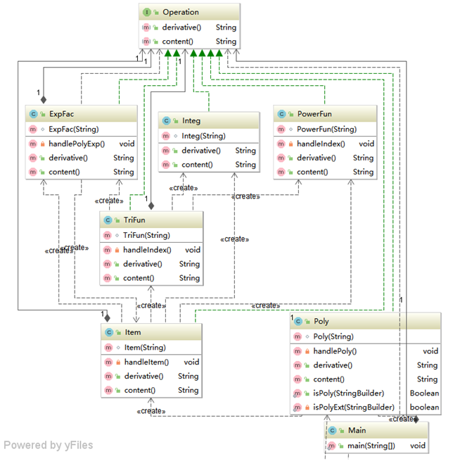 依照老师的提示,对不同因子以及不同的因子间运算方式建立了不同的类,这些类需要共同实现的方法,求导和返回保存的内容。因此建立了一个接口,包含了这两个方法,让各个类实现这个接口。然后便是类似于编译原理中的语法分析一样,在当前对象的求导方法中调用当前对象产生的对象的求导方法,以此实现嵌套函数的求导。程序结构的分析如下图: