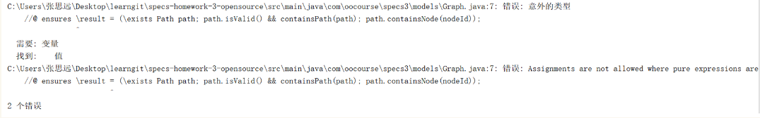 (1)OpenJML:OpenJML可以完成对JML的静态检查,检查JML规格的正确性。比如在规格中少写了一个‘=’,它便会报如下错误: