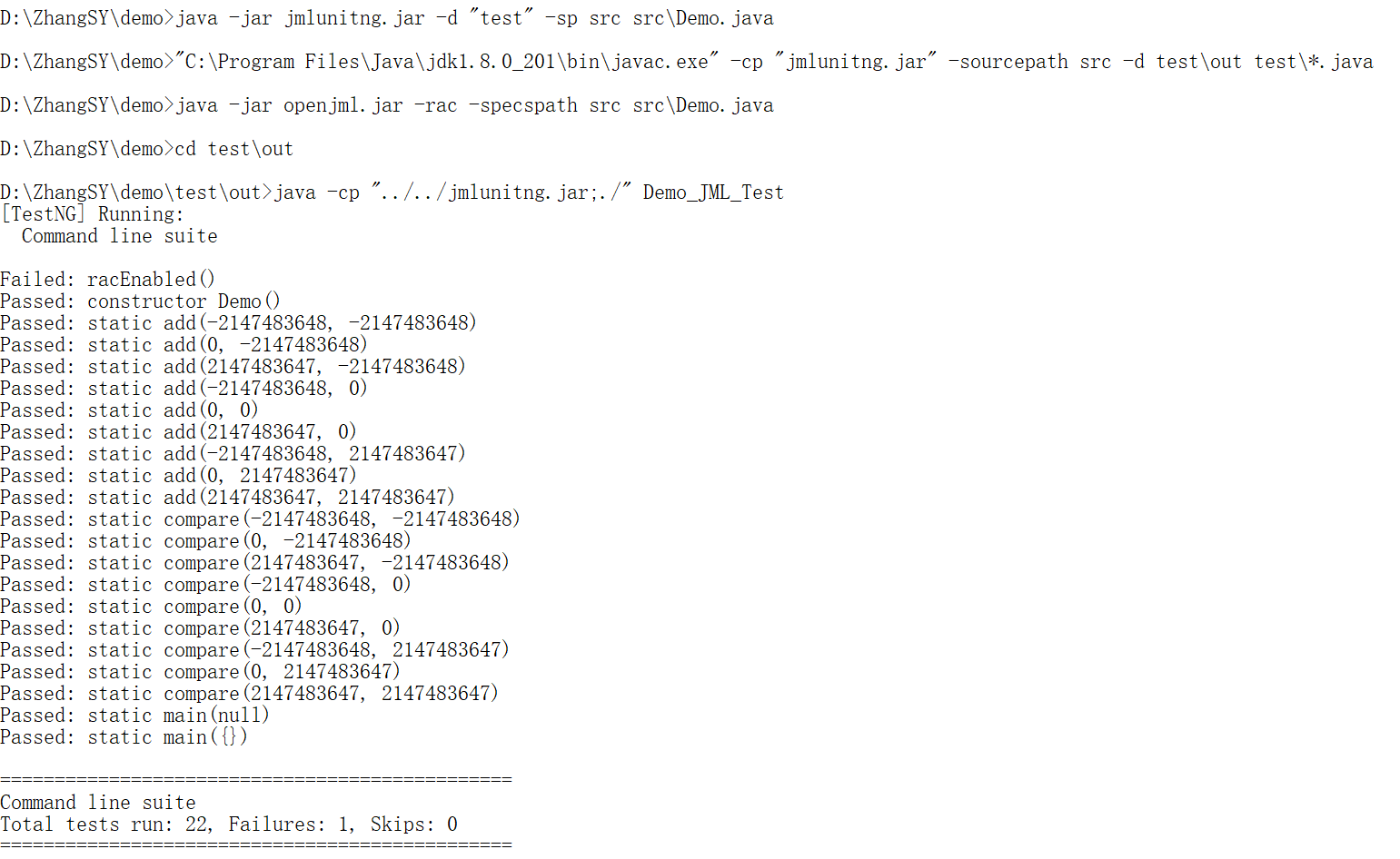 使用jmlunitng工具生成用于测试的.java文件,然后编译成.class文件,最后运行,结果如下图: