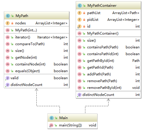 第九次作业只需要实现两个接口的类:MyPath和它对应的容器MyPathContainer即可。路径对象使用一个ArrayList对象存储对应的节点,而路径的容器是用两个ArrayList存储,一个用于存储路径,一个用于存储路径的id。这次作业中不像后两次作业需要复杂的计算,只是需要实现对路径进行增删和计算节点个数等简单的指令,因此两个类都只用较少的成员变量存储信息(MyPath类只有一个成员变量,MyPathContainer只有三个成员变量)。但由于没有考虑时间复杂度,导致我在强侧中有5个点超时了。具体原因是在DISTINCT_NODE_COUNT指令计算所有路径的不同节点个数时,采用了如下: