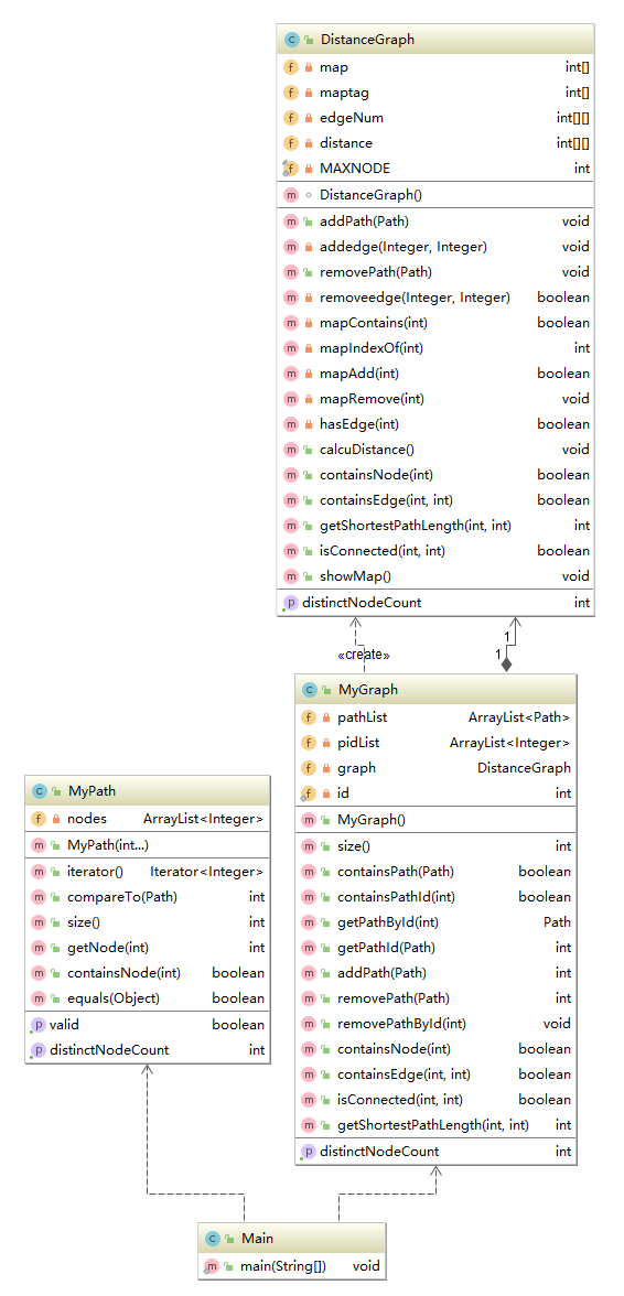 第十次作业把上次作业的路径当做无向图的边并新增了容器中是否存在某一条边、两个结点是否连通、两个结点之间的最短路径三条指令。我按照指导书的建议把无向图单独建立一个类,所以此次的架构较上次相比增加了一个类DistanceGraph。MyPath和MyGraph更上次基本相同。MyPath类吸取了上次作业教训,在构造函数时就计算好该路径的不同节点个数,需要查询时之间返回即可。MyGraph类新增了三条指令对应的方法,并在之前的方法内加上对DistanceGraph类实例化对象的操作。DistanceGraph类采用了邻接表存储无向图,因为节点的id是任意的,所以需要节点id向0-MAXNODE的映射,并有一个标志记录映射的有效性,这是通过两个数组完成的。因为有了上次超时的惨痛经历,我在这次作业中能采用数组的尽量采用数组来保证存取的效率。看完课程组发的第十一作业的架构后觉得我这样做虽然提高了效率,但弱化面向对象语言对象在其中的地位(比如官方参考架构的边和节点都有单独的类,而我边和节点都是直接用数组保存在了DistanceGraph类里,从架构上讲显然是前者更符合面向对象语言的特点,但后者更有利于运行效率,需要我权衡一下在这两方面的取舍)。对于运算的缓存,有一种做法是如果需要计算两个节点的最短距离已经缓存下来就直接返回结果,否则进行计算并缓存计算的结果。而我采用的是另一种做法,每当有增删边的指令执行后(图结构改变)就用Dijkstra算法计算任意两点的最短距离并保存。考虑到图结构变更指令总数不超过20条并且Dijkstra算法是直接用二维数组进行计算(如果采用前者策略,则应当用Floyd算法,这就需要一个容器保存已经计算过的节点),这两种策略效率应该不会差很多,在内存的占用上,后者会更少(因为前者还需要记录哪些数据缓存了)。
