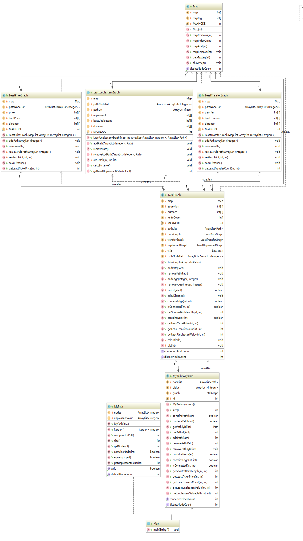 可以看出第十一次作业比上次作业多了许多类,Total类对多种图进行统一管理,LeastPriceGraph、LeastTransferGraph、LeastUnpleasantGraph三个类对应了三种类型的图,除了对图内边的权值赋值不同外,其余的都大同小异,和上次作业的DistanceGraph类相似。为了使架构更符合单一职责原则,我把在上次作业中的DistanceGraph类内的节点id和邻接表下标的对应关系及提供的相应方法分离成了一个Map类。总的来说,此次作业的内容较上次相比只是增加了几张图,实现并无太大难度。架构方面虽然不如官方参考架构那样细化地分成许多类,但我个人觉得这样的架构已经很好的满足了java的设计原则。