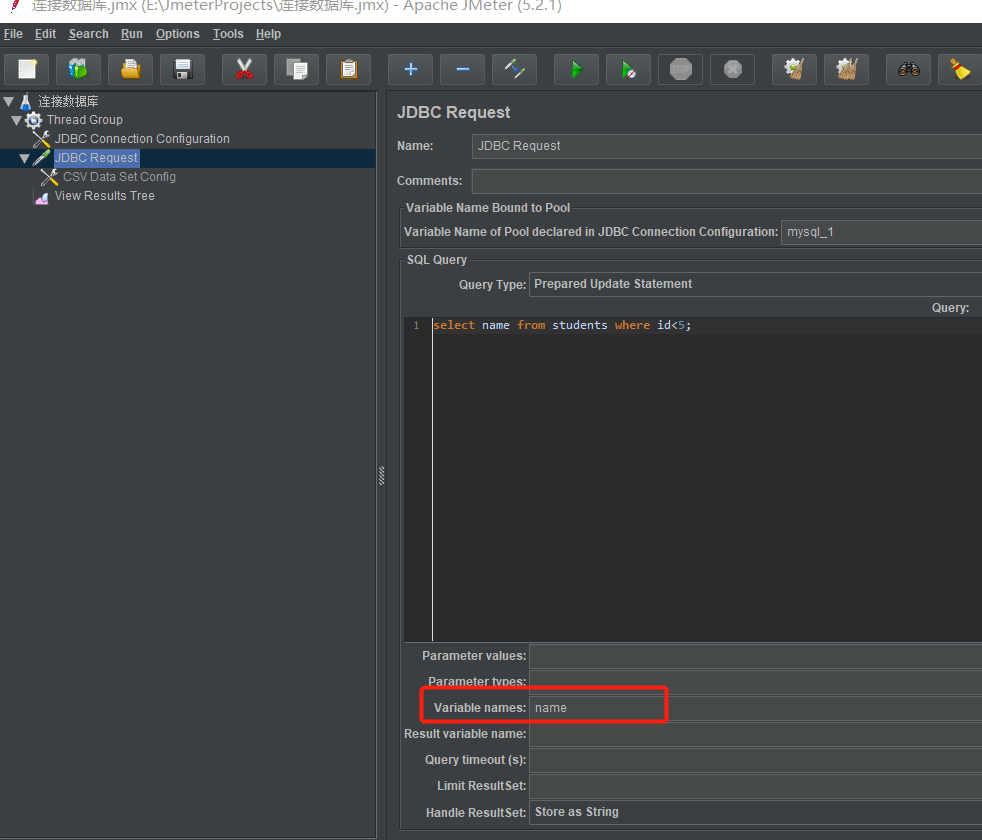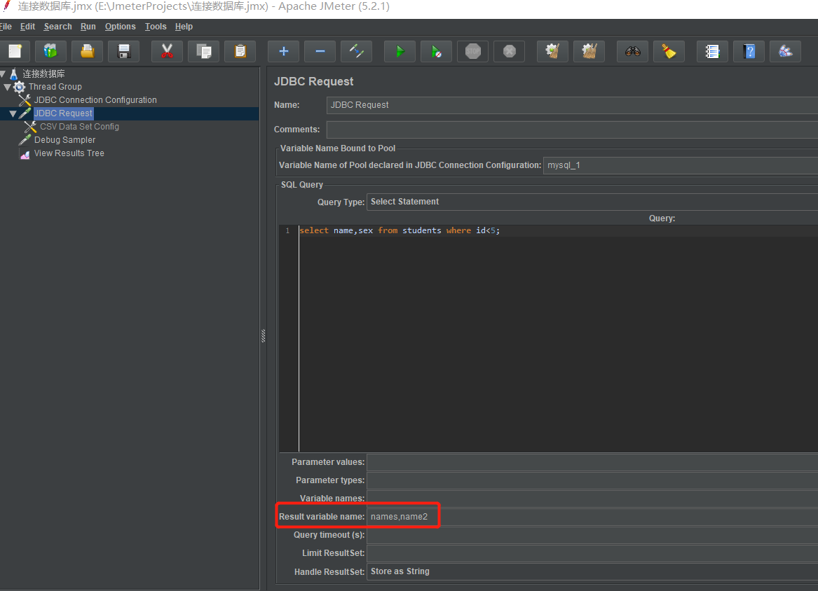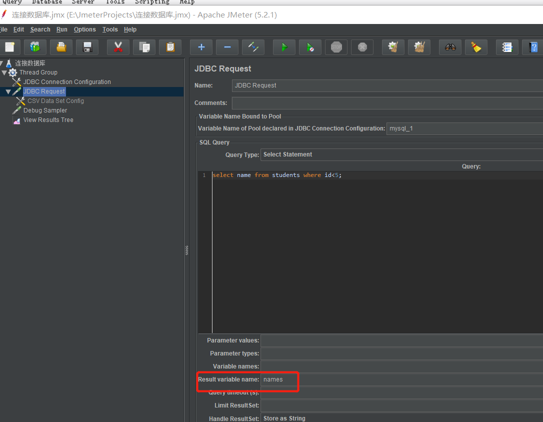 1.创建测试计划、添加sampler、listener,variable name用于存放查询的结果变量名,如果有多个变量,用逗号隔开。注意query type,我这里其实选错了,运行时报错。应该是select statement