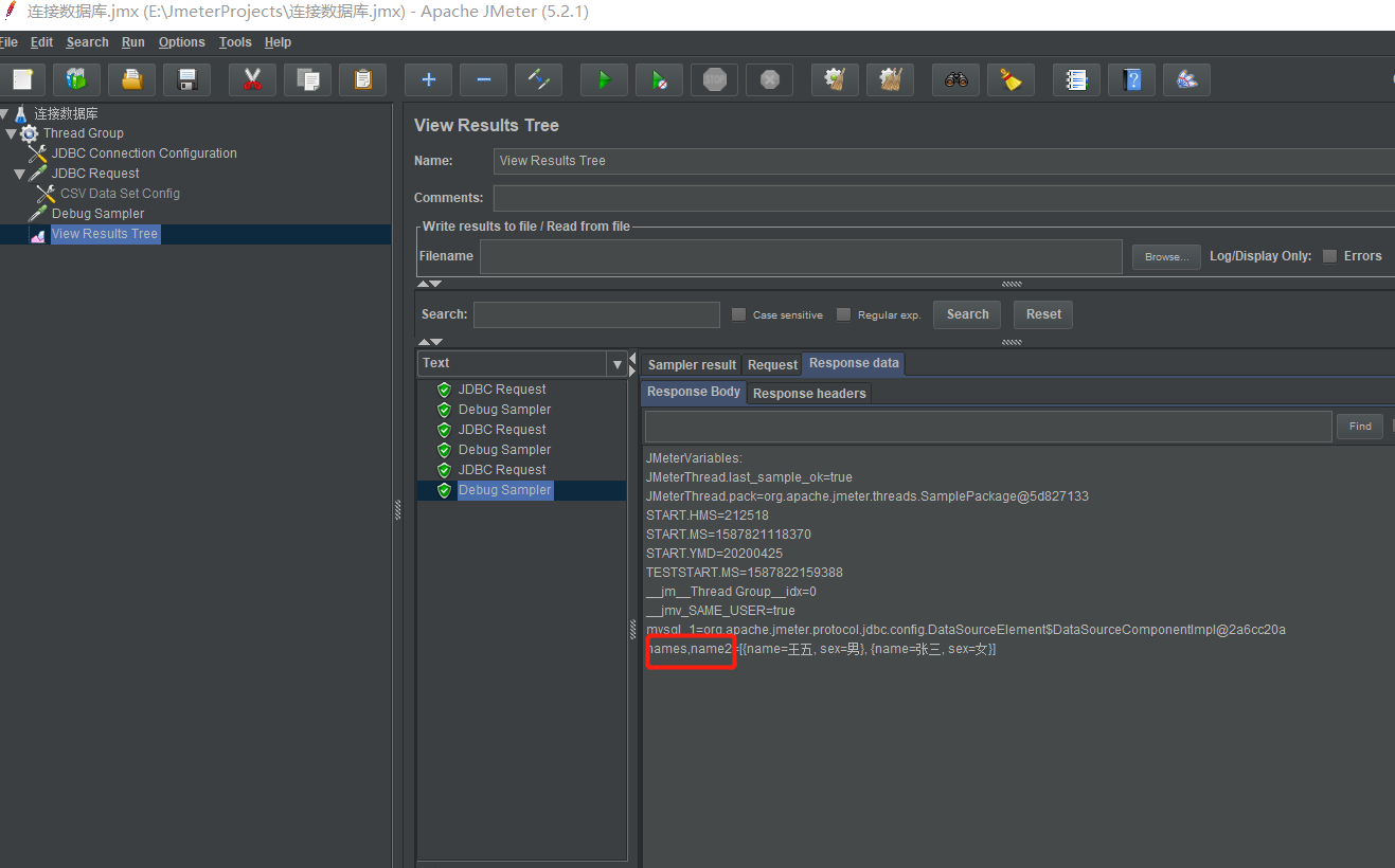 b.添加jdbc connector conf和JDBC request。这里同插入单行语句,不再赘述