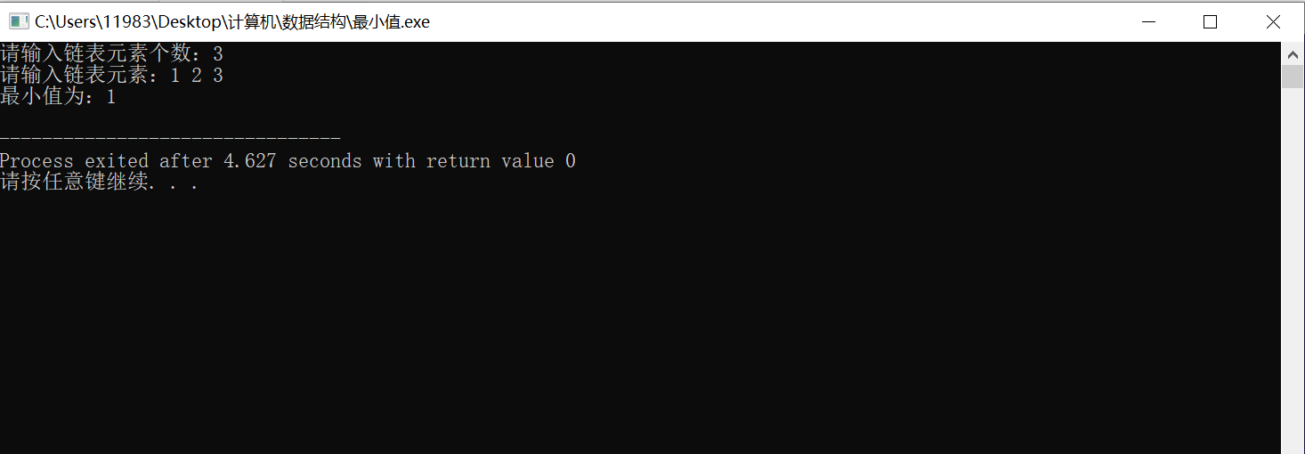 #include "com_def.h" #include "def.h" typedef struct LNode{ ElemType data; struct LNode *next; }LNode,*LinkList; LinkList Init_L(int n) { LinkList L=(LinkList)malloc(sizeof(LNode)); LinkList p=L; int x; printf("请输入链表元素:"); for(int i=0;i<n;i++) { LinkList e=(LinkList)malloc(sizeof(LNode)); scanf("%d",&x); e->data=x; p->next=e; p=e; } p->next=NULL; L=L->next; } Status Found_L(LinkList L) { int min; LinkList p=L; min=p->data; while(p){ if(p->data <= min){ min=p->data; } p=p->next; } L=L->next; printf("最小值为:%d\n",min); } int main() { int n; printf("请输入链表元素个数:"); scanf("%d",&n); LinkList L; L=Init_L(n); Found_L(L); }