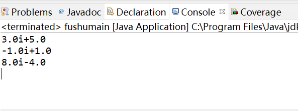 public class fushumain { public static void main(String[] args) { // TODO Auto-generated method stub fushu c1=new fushu(1,3); fushu c2=new fushu(2,2); c1.add(c2); System.out.println(c1.toString()); c1.decrease(c2); System.out.println(c1.toString()); c1.mutiply(c2); System.out.println(c1.toString()); } }