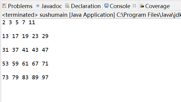 - 先建立一个类,在这个类里面对100以内的数进行判断。这里是设置了两个相当于计数器的变量,一个是计数是否出了自己和1外,还有别的数可以除尽。还有一个是因为他要求5个为一行输出,对其进行计数。在每次循环完成的时候,记得把计数器的值调为0,否则就会只输出2,3.