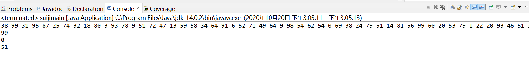 public class suijimain { public static void main(String[] args) { // TODO Auto-generated method stub suiji c1=new suiji(); c1.shengcheng(); c1.Max(); c1.Min(); c1.Compare(50); System.out.println(c1.getmax()); System.out.println(c1.getmin()); System.out.println(c1.getnum()); } }