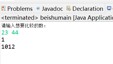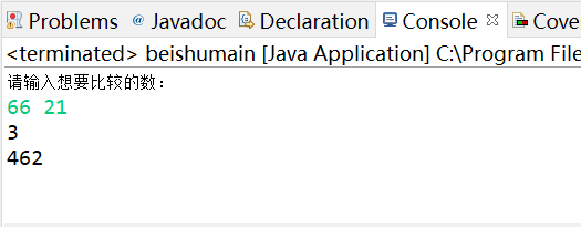 import java.util.Scanner; public class beishumain { public static void main(String[] args) { // TODO Auto-generated method stub int a,b,i; System.out.println("请输入想要比较的数:"); Scanner sc=new Scanner(System.in); a=sc.nextInt(); b=sc.nextInt(); if(a<b) { i=a; a=b; b=i; } beishu c1=new beishu(a,b); c1.Compare(); System.out.println(c1.getyue()); System.out.println(c1.getbei()); } }