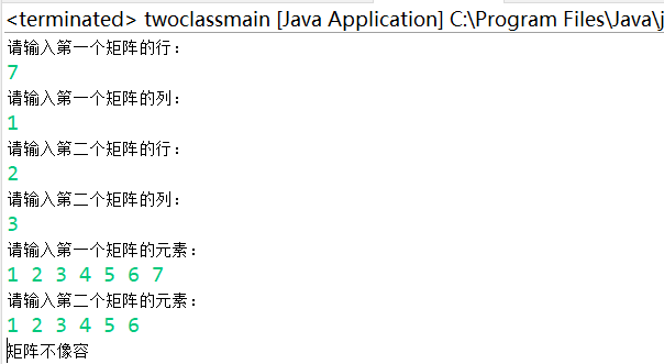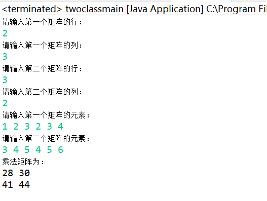 import java.util.Scanner; public class twoclassmain { public static void main(String[] args) { // TODO Auto-generated method stub Scanner sc = new Scanner(System.in); int [][] c1; System.out.println("请输入第一个矩阵的行:"); int a1=sc.nextInt(); System.out.println("请输入第一个矩阵的列:"); int b1=sc.nextInt(); c1=new int[a1][b1] ; System.out.println("请输入第二个矩阵的行:"); int a2=sc.nextInt(); System.out.println("请输入第二个矩阵的列:"); int b2=sc.nextInt(); int [][] c2=new int[a2][b2]; System.out.println("请输入第一个矩阵的元素:"); for(int i=0;i<a1;i++) { for(int j=0;j<b1;j++) { c1[i][j] =sc.nextInt(); } } System.out.println("请输入第二个矩阵的元素:"); for(int i=0;i<a2;i++) { for(int j=0;j<b2;j++) { c2[i][j]=sc.nextInt(); } } TwoClass c3=new TwoClass(); c3.Matrix(c1, c2); } }