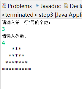 import java.util.Scanner; public class step3 { public static void main(String[] args) { // TODO Auto-generated method stub Scanner sc=new Scanner(System.in); System.out.println("请输入第一行*号的个数:"); int m=sc.nextInt(); System.out.println("请输入列数:"); int n=sc.nextInt(); int b=n; for(int i=0;i<n;i++) { for(int j=0;j<b-1;j++) { System.out.print(" "); } for(int k=0;k<m;k++) { System.out.print("*"); } m=m+2; b=b-1; System.out.println(); } } }
