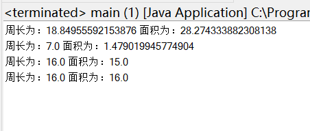 public class main { public static void main(String[] args) { // TODO Auto-generated method stub Circle c1=new Circle(3); System.out.println("周长为:"+c1.getL()+" 面积为:"+c1.getArea()); Triangle c2=new Triangle(1,3,3); System.out.println("周长为:"+c2.getL()+" 面积为:"+c2.getArea()); Rectangle c3=new Rectangle(3,5); System.out.println("周长为:"+c3.getL()+" 面积为:"+c3.getArea()); Square c4=new Square(4); System.out.println("周长为:"+c4.getL()+" 面积为:"+c4.getArea()); } }