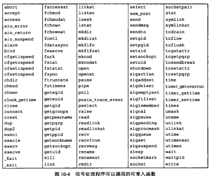 SUS说明了可以在信号处理程序中保证调用安全的函数。这些函数是可重入的,并被称为是异步信号安全的。这些函数除了可重入,它还会阻止任何引起不一致的信号发送。