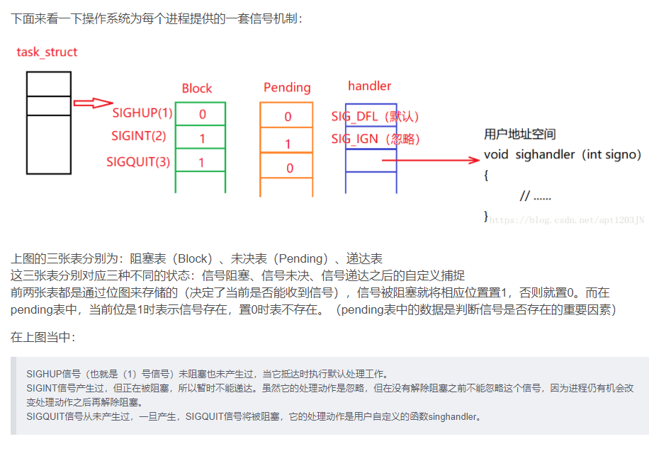 * 信号阻塞(Block):进程可以选择阻塞某个信号,被阻塞的信号产生时将保持在未决状态,直到进程解除对此信号的阻塞,才执行递达的动作