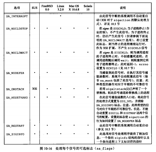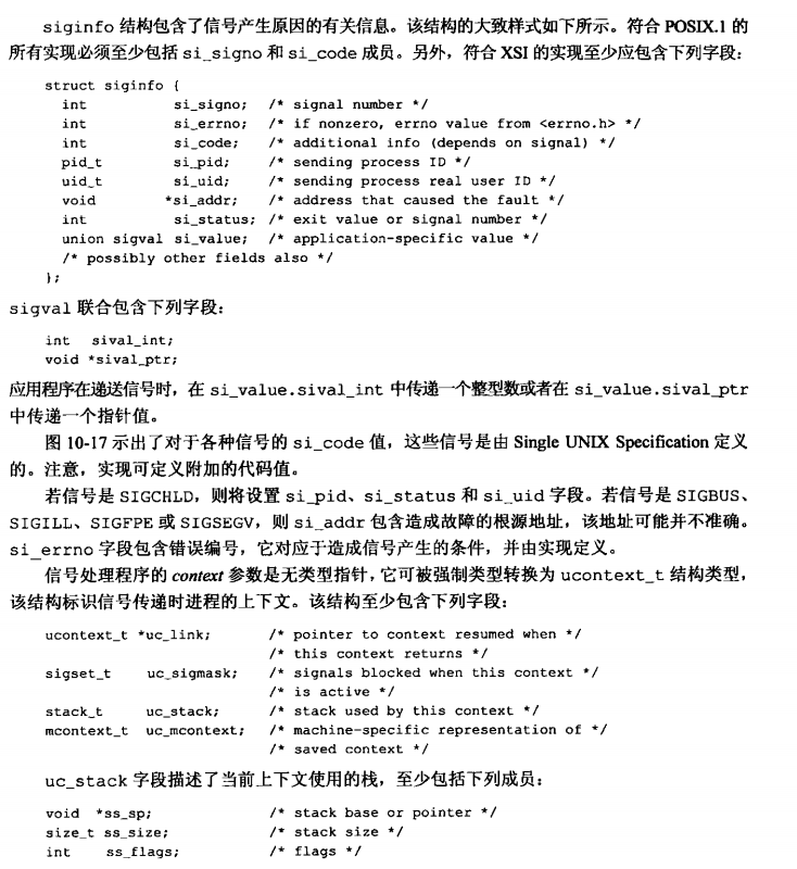 sa_sigaction字段是一个替代的信号处理程序,在sa_flag指定了SA_SIGINFO标志时,使用该种信号处理程序。对于sa_handler和sa_sigaction字段,实现可能使用同一存储区,所以只能使用其中一种。