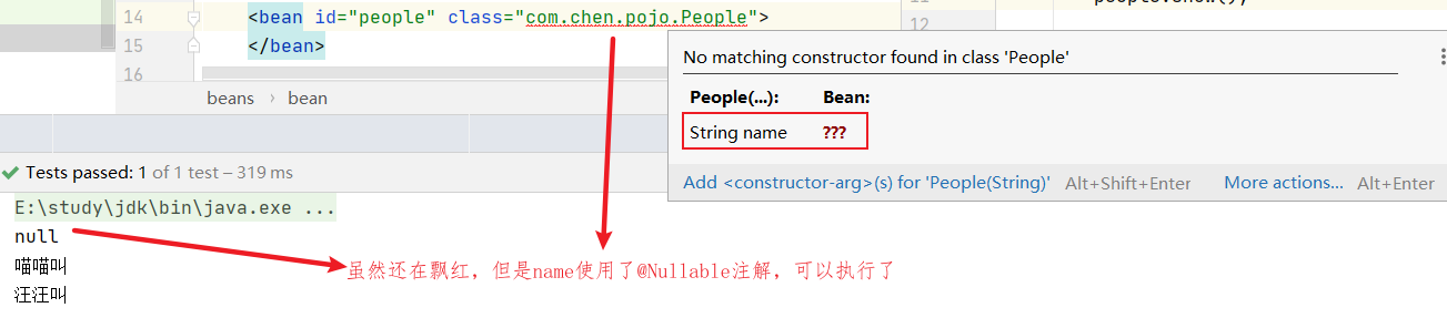 正常实体类如果定义有参构造,那么在xml配置文件中必须要用相应的定义<constructor-arg name="name" value="chen"/>