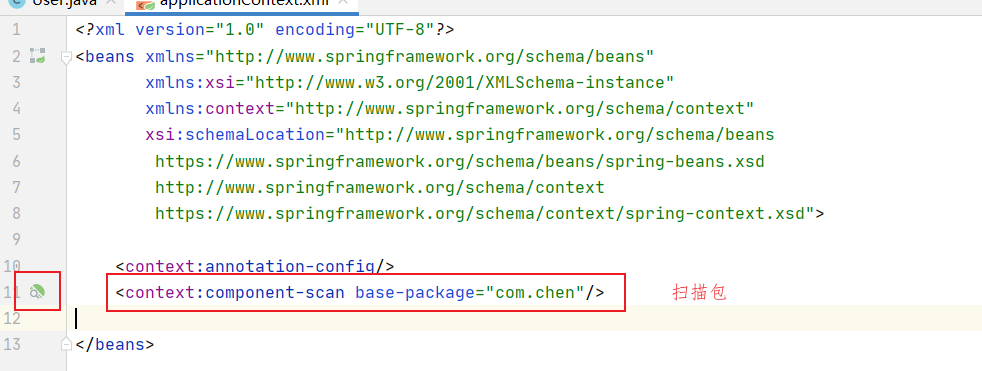 使用注解时候context标签开始扫描注解。扫描包里面的类,方法,属性是否有注解。当包下的某个类里面有注解实现bean到容器中,前面就有个小叶子