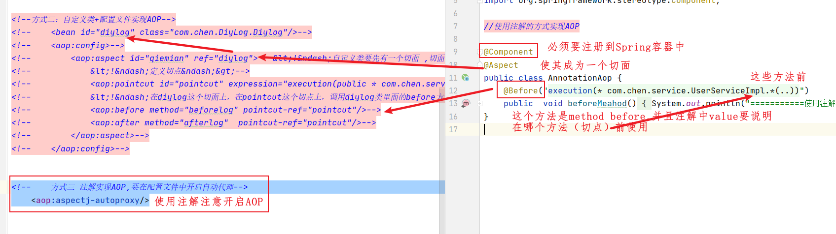 @Component @Aspect public class AnnotationAop { @Before("execution(* com.chen.service.UserServiceImpl.*(..))") public void beforeMeahod(){ System.out.println("===========使用注解实现AOP方法前=================="); } @Around("execution(* com.chen.service.UserServiceImpl.*(..))")