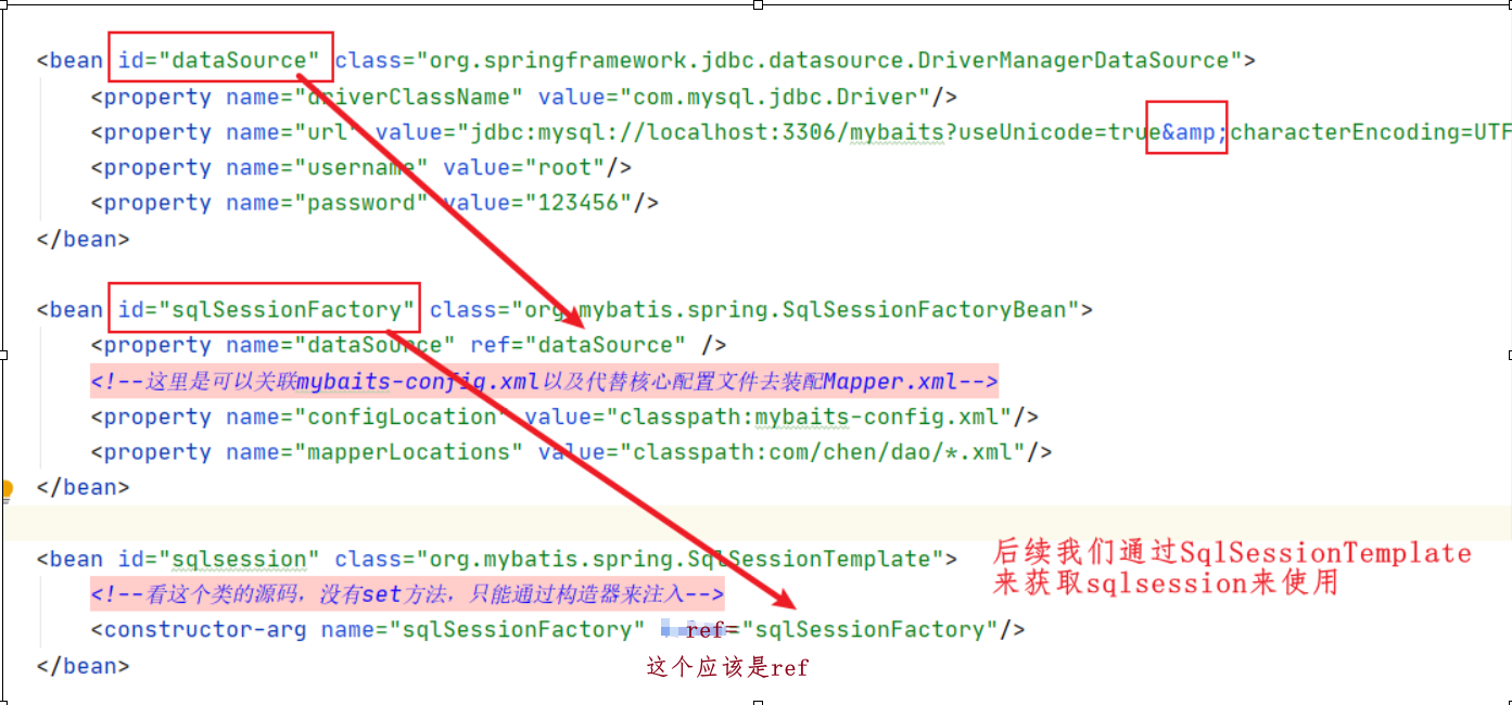 <bean id="sqlsession" class="org.mybatis.spring.SqlSessionTemplate"> <!--看这个类的源码,没有set方法,只能通过构造器来注入 注意这里是ref--> <constructor-arg name="sqlSessionFactory" ref="sqlSessionFactory"/> </bean>