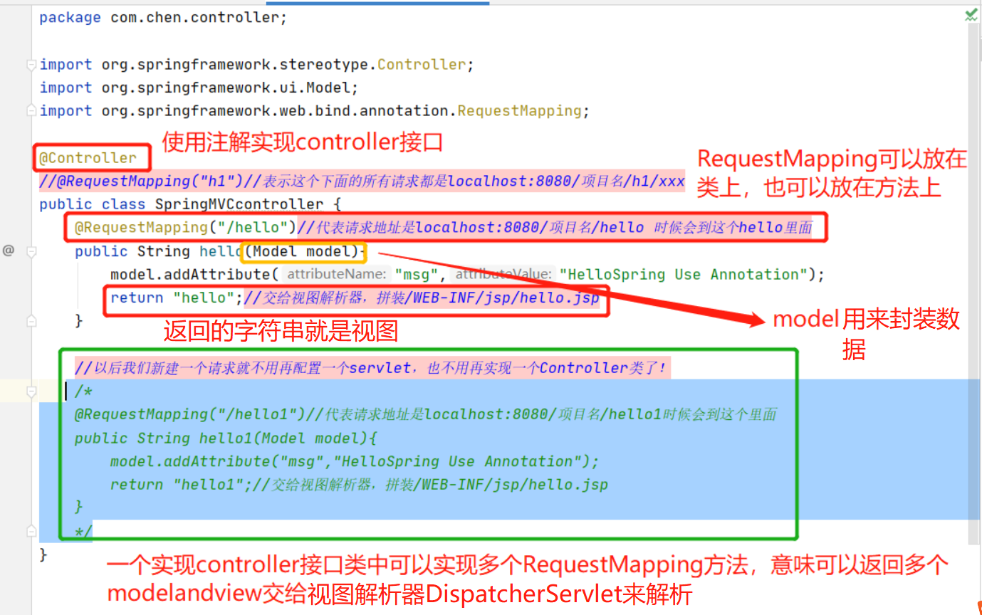 package com.chen.controller; import org.springframework.stereotype.Controller; import org.springframework.ui.Model; import org.springframework.web.bind.annotation.RequestMapping; @Controller //@RequestMapping("h1")//表示这个下面的所有请求都是localhost:8080/项目名/h1/xxx 多级路径会使用到 public class SpringMVCcontroller { @RequestMapping("/hello")//代表请求地址是localhost:8080/项目名/hello 时候会到这个hello里面 public String hello(Model model){ model.addAttribute("msg","HelloSpring Use Annotation"); //model封装数据 return "hello";//交给视图解析器,拼装/WEB-INF/jsp/hello.jsp //返回视图 view } //以后我们新建一个请求就不用再配置一个servlet,也不用再实现一个Controller类了! /* @RequestMapping("/hello1")//代表请求地址是localhost:8080/项目名/hello1时候会到这个里面 public String hello1(Model model){ model.addAttribute("msg","HelloSpring Use Annotation"); return "hello1";//交给视图解析器,拼装/WEB-INF/jsp/hello1.jsp } */ }