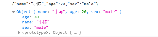<!DOCTYPE html> <html lang="en"> <head> <meta charset="UTF-8"> <title>Title</title> <script> var User={ name:"小陈", age:20, sex:"male" }; var json =JSON.stringify(User); //转为字符串 var user =JSON.parse(json); //转为对象 console.log(json); console.log(user); </script> </head> <body> </body> </html>