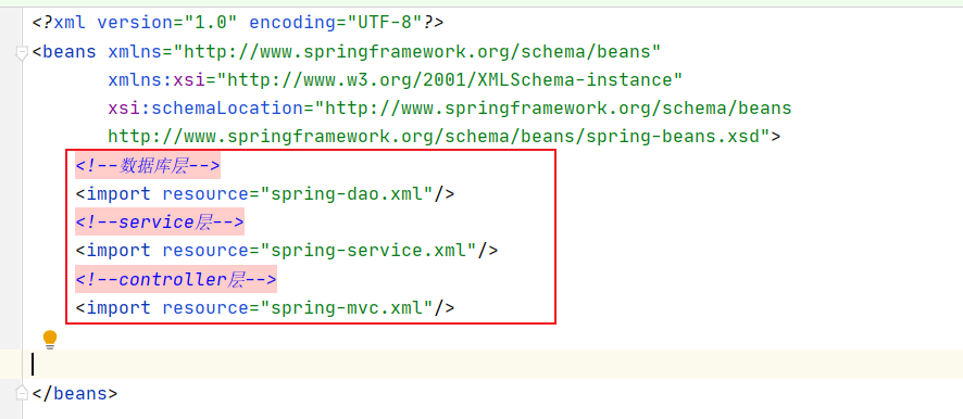 <?xml version="1.0" encoding="UTF-8"?> <beans xmlns="http://www.springframework.org/schema/beans" xmlns:xsi="http://www.w3.org/2001/XMLSchema-instance" xmlns:context="http://www.springframework.org/schema/context" xsi:schemaLocation="http://www.springframework.org/schema/beans http://www.springframework.org/schema/beans/spring-beans.xsd http://www.springframework.org/schema/context http://www.springframework.org/schema/context/spring-context.xsd"> <!-- 扫描service相关的bean --> <context:component-scan base-package="com.kuang.service" /> <!--BookServiceImpl注入到IOC容器中--> <bean id="BookServiceImpl" class="com.kuang.service.BookServiceImpl"> <property name="bookMapper" ref="bookMapper"/> </bean> <!-- 配置事务管理器 --> <bean id="transactionManager" class="org.springframework.jdbc.datasource.DataSourceTransactionManager"> <!-- 注入数据库连接池 --> <property name="dataSource" ref="dataSource" /> </bean> </beans>