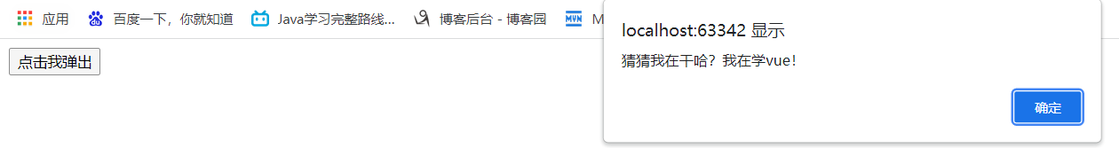 <!DOCTYPE html> <html lang="en" xmlns:v-on="http://www.w3.org/1999/xhtml"> <head> <meta charset="UTF-8"> <title>Title</title> </head> <body> <div id="app"> <button v-on:click="sayHi('猜猜我在干哈?')"> 点击我弹出</button> </div> <script src="https://cdn.jsdelivr.net/npm/vue@2.5.16/dist/vue.js"></script> <script> var vm=new Vue({ el: "#app", data: { message: "我在学vue!" }, methods:{ //方法必须定义在Vue的methods中 sayHi:function (a) { alert(a+this.message); } } }); </script> </body> </html>